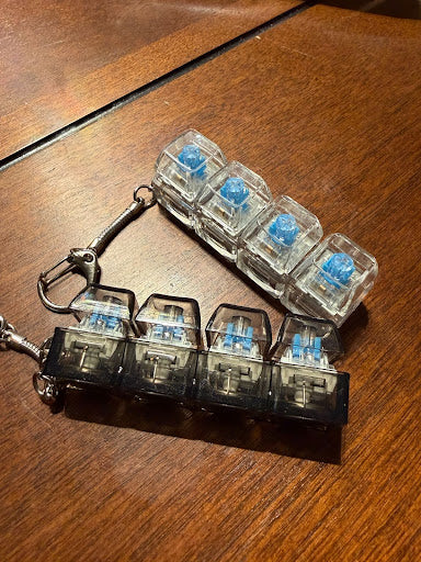 A Click Fidget is a small keychain fidget with real mechanical keyboard switches that make satisfying clicking sounds when pressed.